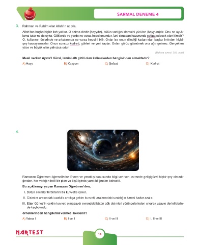 III. Eğer Güneş’in çekim kuvveti olmasaydı evrendeki bütün gök cisimleri yörüngelerinden çıkarak uzayın derinliklerin-