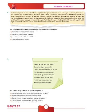 4. Günümüzde şehirleşmenin hızla artması, yeşil alanların giderek azalmasına neden oluyor. Bu durum, hem ekosis-