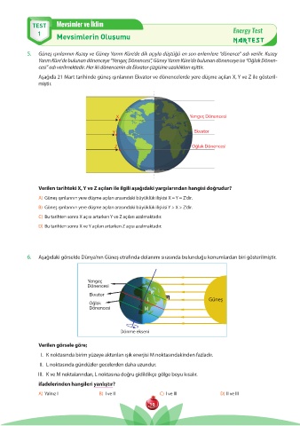 5. Güneş ışınlarının Kuzey ve Güney Yarım Küre’de dik açıyla düştüğü en son enlemlere “dönence” adı verilir. Kuzey