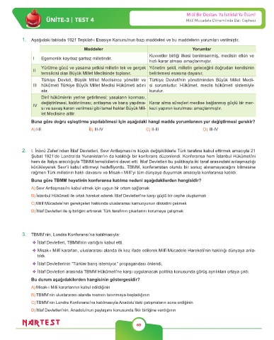1.  Aşağıdaki tabloda 1921 Teşkilat-ı Esasiye Kanunu'nun bazı maddeleri ve bu maddelerin yorumları verilmiştir.