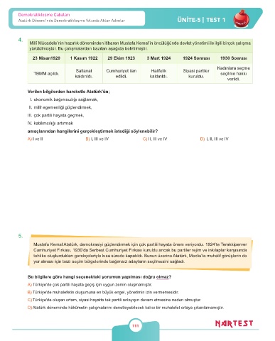 Atatürk Dönemi'nde Demokratikleşme Yolunda Atılan Adımlar                ÜNİTE-5 |    TEST 1
