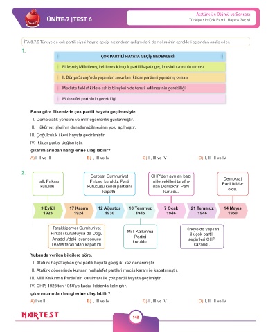 ÜNİTE-7 |    TEST 6                                                Türkiye'nin Çok Partili Hayata Geçişi